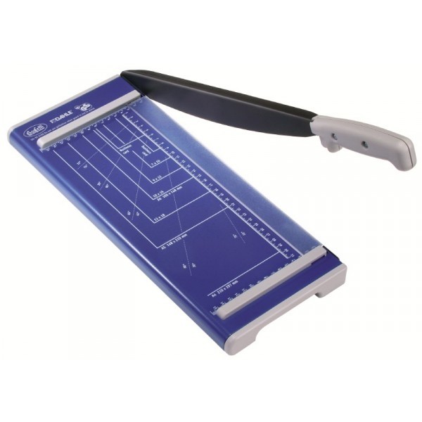 Taglierina a leva con piano in metallo prestampato con formati DIN, 2 squadre laterali centimetrate, lame in acciaio. Pressino manuale proteggidita. Luce di taglio 320 mm, spessore di taglio max 15 fogli da 70 g (1,5 mm), dimensione piano 420x175 mm. Garanzia 2 anni.
