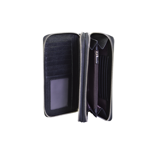 Questo portafoglio realizzato interamente in pelle ha due scomparti con zip, uno all’interno del quale è possibile riporre le carte di credito e le fidelity card, e l’altro che, oltre ad alcuni slot per le carte di credito, può contenere anche banconote e monete.